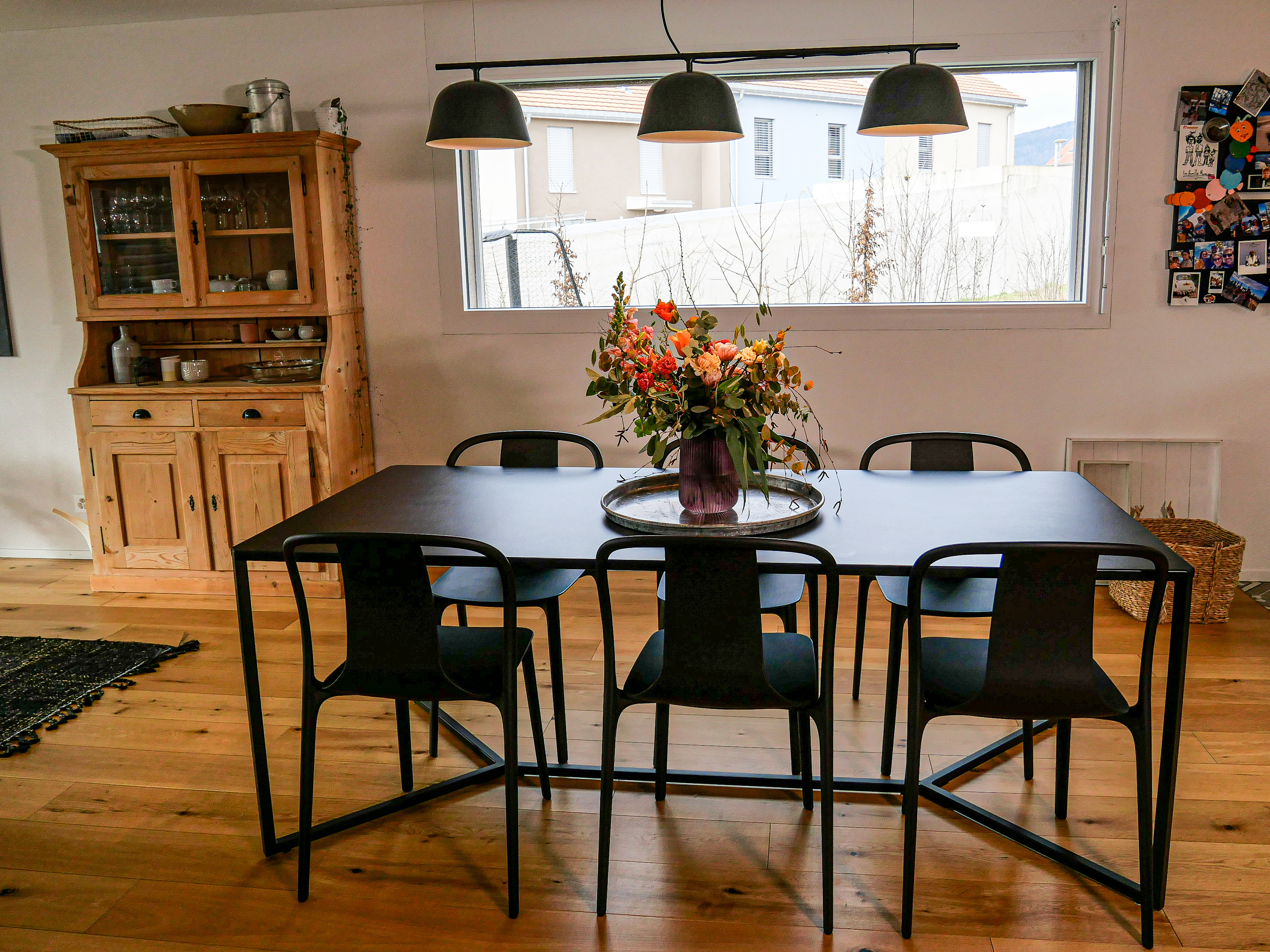 La sélection minutieuse de couleurs neutres et de matériaux naturels dans cette maison sert de toile de fond idéale pour mettre en valeur à la fois la modernité et le charme des pièces anciennes. Te sens-tu inspiré(e) à expérimenter avec des nuances de gris et des touches de bois clair chez toi ? La cohérence de cette palette crée une sensation de calme et d’unité, tout en permettant aux éléments distinctifs – comme un vaisselier vintage ou une suspension en métal noir – de briller.