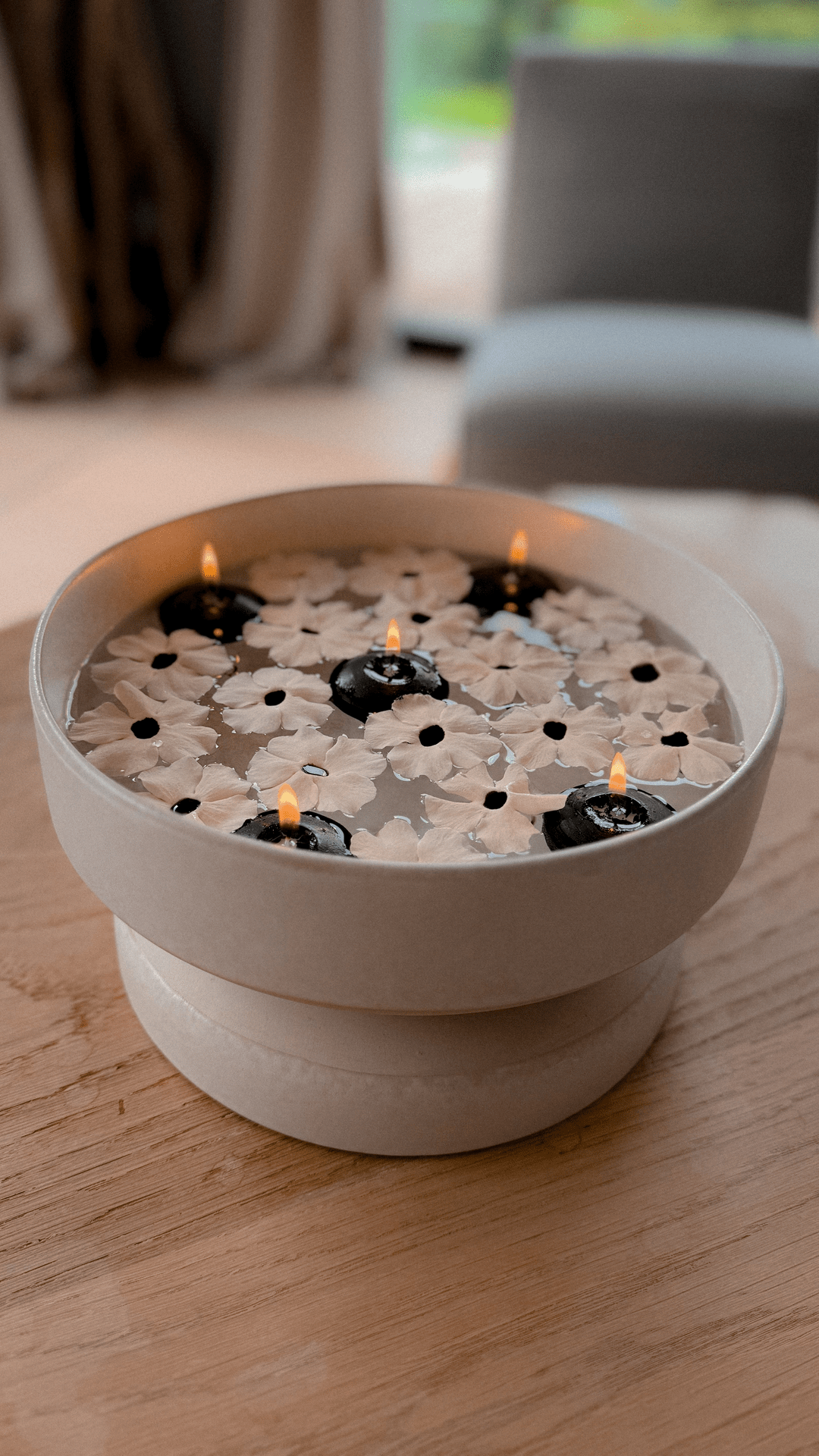 Pas faciles à dénicher, mais je voulais absolument trouver des bougies flottantes noires que je trouvais très classes et contrastantes avec mes fleurs de Suzanne !